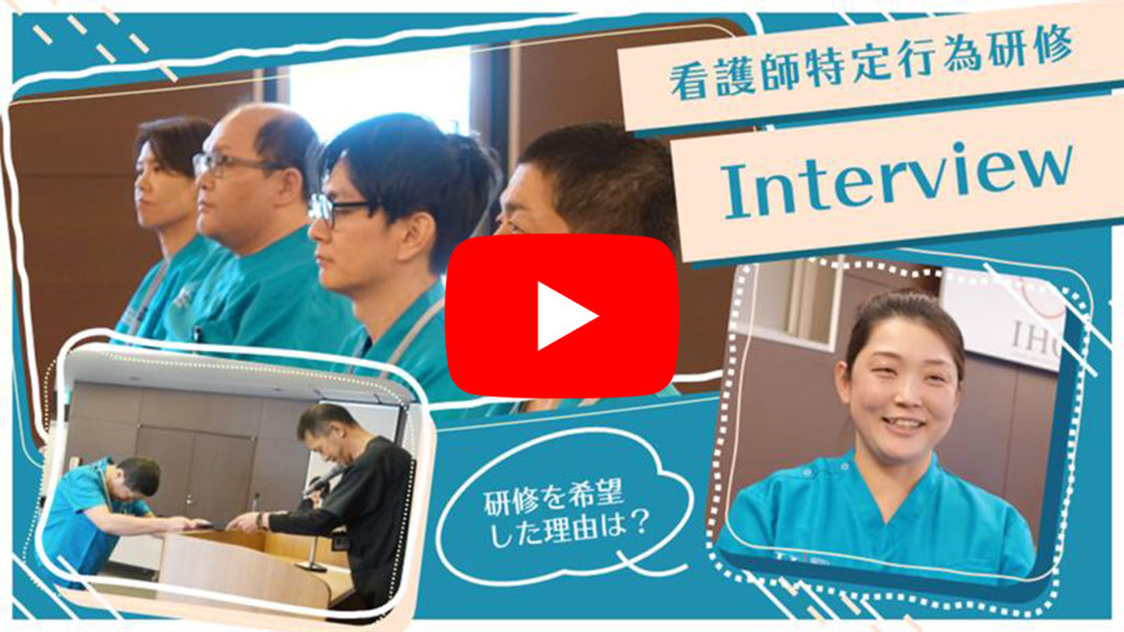 特定行為に係わる看護師の研修制度は、保健師助産師看護師法に位置付けられた研修制度です。愛媛県では、愛媛大学医学部附属病院開校に続いての開校となります。医師の手順書により、1年間を掛けて自分の選択した行為について学びを深めます。研修を修了した看護師には、患者さんお状態を見極め、タイムリーな対応をすることができます。院内においては、学び得た知識・技術を活かし看護師に教育指導を行うと共に、地域の訪問看護等で活躍できます。HITO病院は、石川ケアヘルスグループ(愛美会・健康会・HITO病院)の中に、訪問看護ステーションがありますから、そこでの活躍も期待されています。講師の先生方も丁寧に教えて下さいますから、他の施設から来られた研修生と共に成長しましょう。