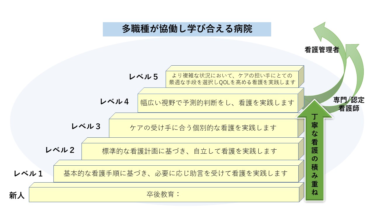 看護師の臨床実践に必要な能力を段階的に表現したものです。2025年に向けて世界に例のない少子・超高齢・多死社会を迎える日本では、医療提供体制の変化に伴い、暮らしと医療を支える看護提供システムの構築が求められています。個々の看護師が所属する施設の枠にとどまらず、全国レベルで共通して活用するために日本看護協会が開発したクリニカルラダーとの整合性を図り作成しています。
