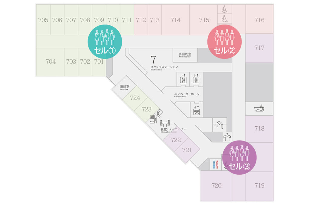 各病棟にて、HITO 病院独自の多職種協働セルケアシステム® を取り入れています。
